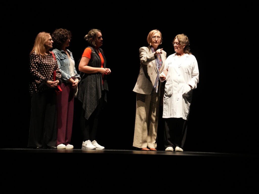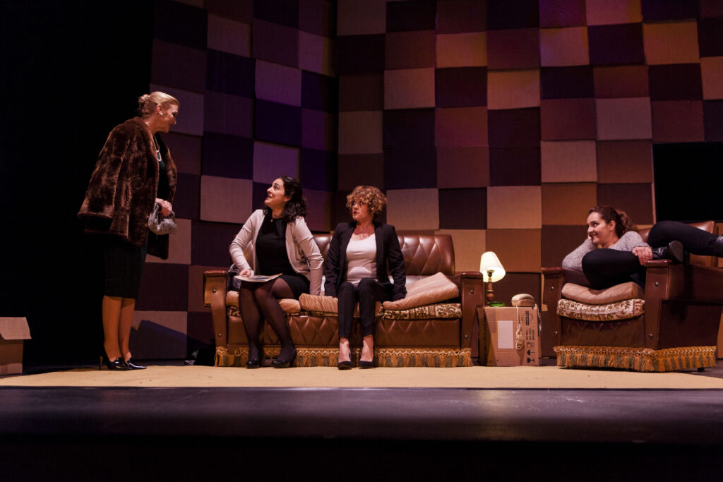 No abras a nadie (2014), escrita por Francesc Sanguino, dirigida por Gloria Sirvent. Con Cristina Fenollar, Mila García, Dolores Faraco y Begoña Tenés. Ayudante de dirección, Manuel Ochoa, Escenografía, Joan Miquel Reig. Vestuario, Puri Moya, Diseño gráfico, Francesc Guevara, producción ejecutiva, Puri Moya. Producción de El Club de la Serpiente. (Foto de Iván Jiménez.)
